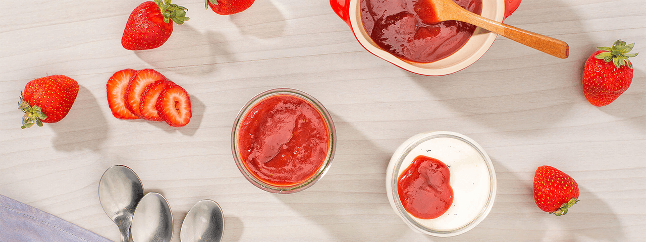 5 Servir el coulis de fresa frío encima de la panna cotta. Decorar con unas fresas.