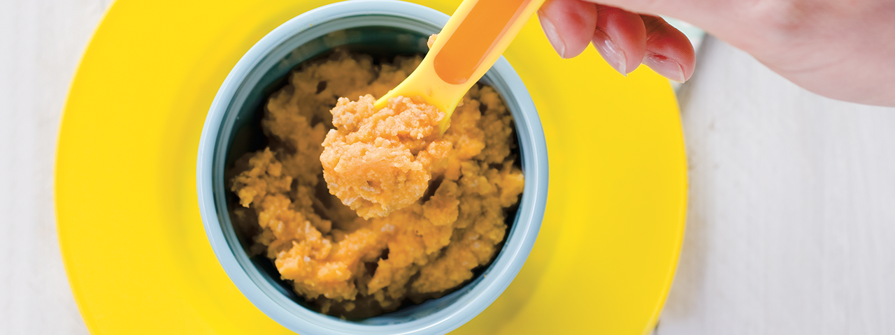 7 Mezcla hasta que quede suave y uniforme (la consistencia variará dependiendo de la introducción de la alimentación complementaria de tu bebé), añadiendo el aceite de oliva mientras remueves.